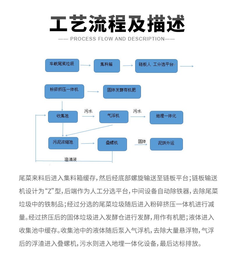 (1)尾菜垃圾利用运输车倾倒在接料斗里,物料卸下后自动输送至分拣链板平台;